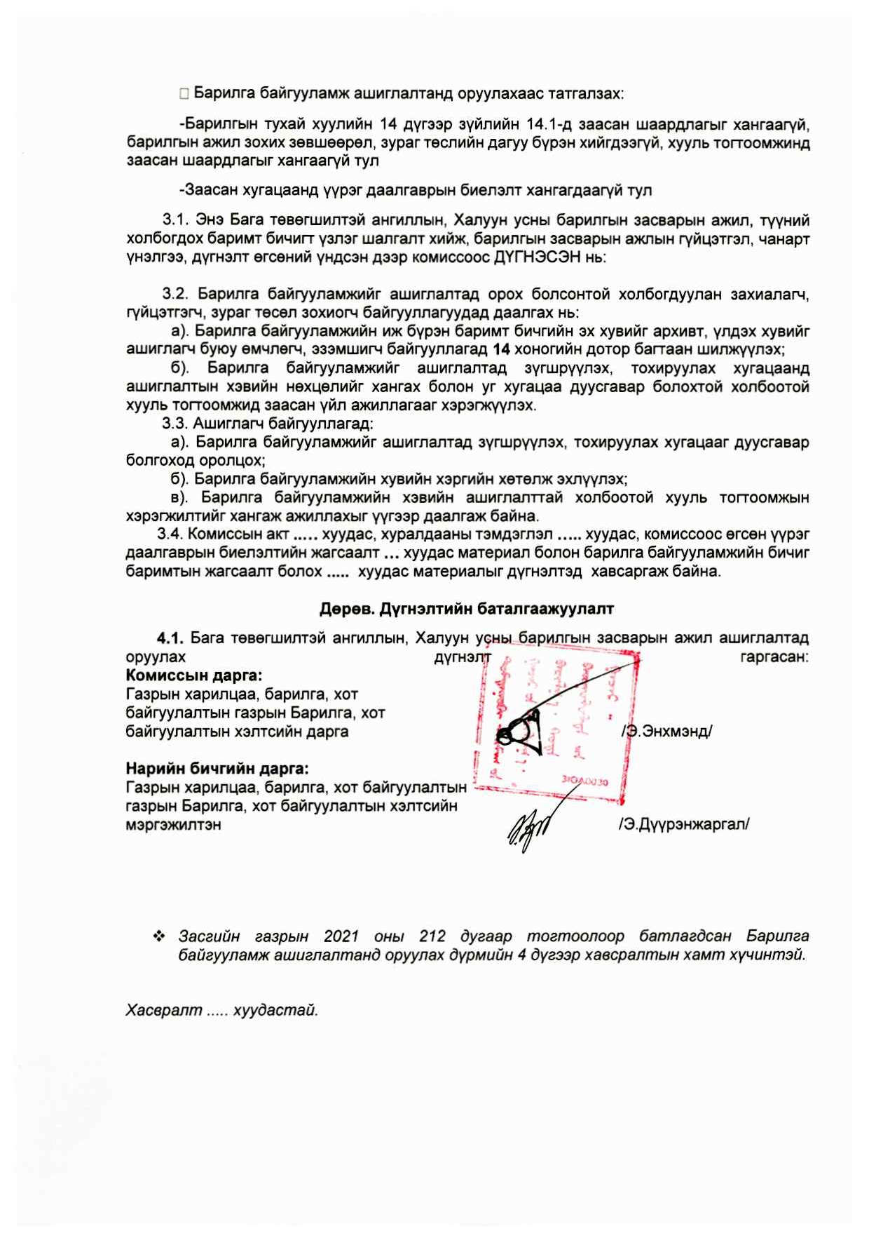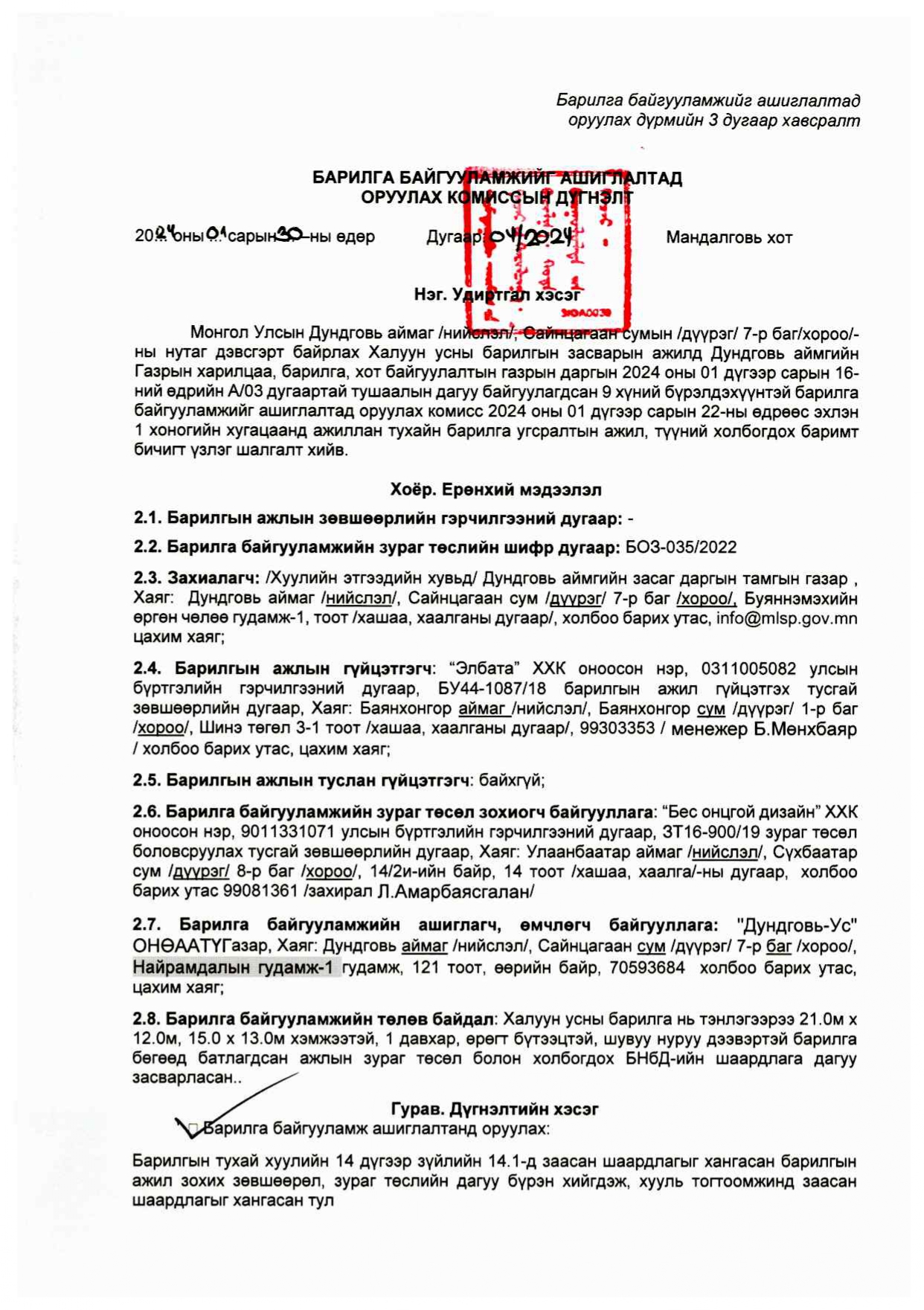 БАРИЛГА БАЙГУУЛАМЖИЙГ АШИГЛАЛТАД ОРУУЛАХЫГ ЗӨВШӨӨРСӨН УЛСЫН КОМИССЫН ДҮГНЭЛТ