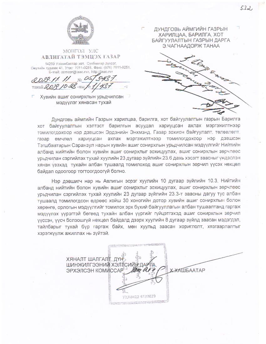 БАРИЛГА БАЙГУУЛАМЖИЙГ АШИГЛАЛТАД ОРУУЛАХЫГ ЗӨВШӨӨРСӨН УЛСЫН КОМИССЫН ДҮГНЭЛТ
