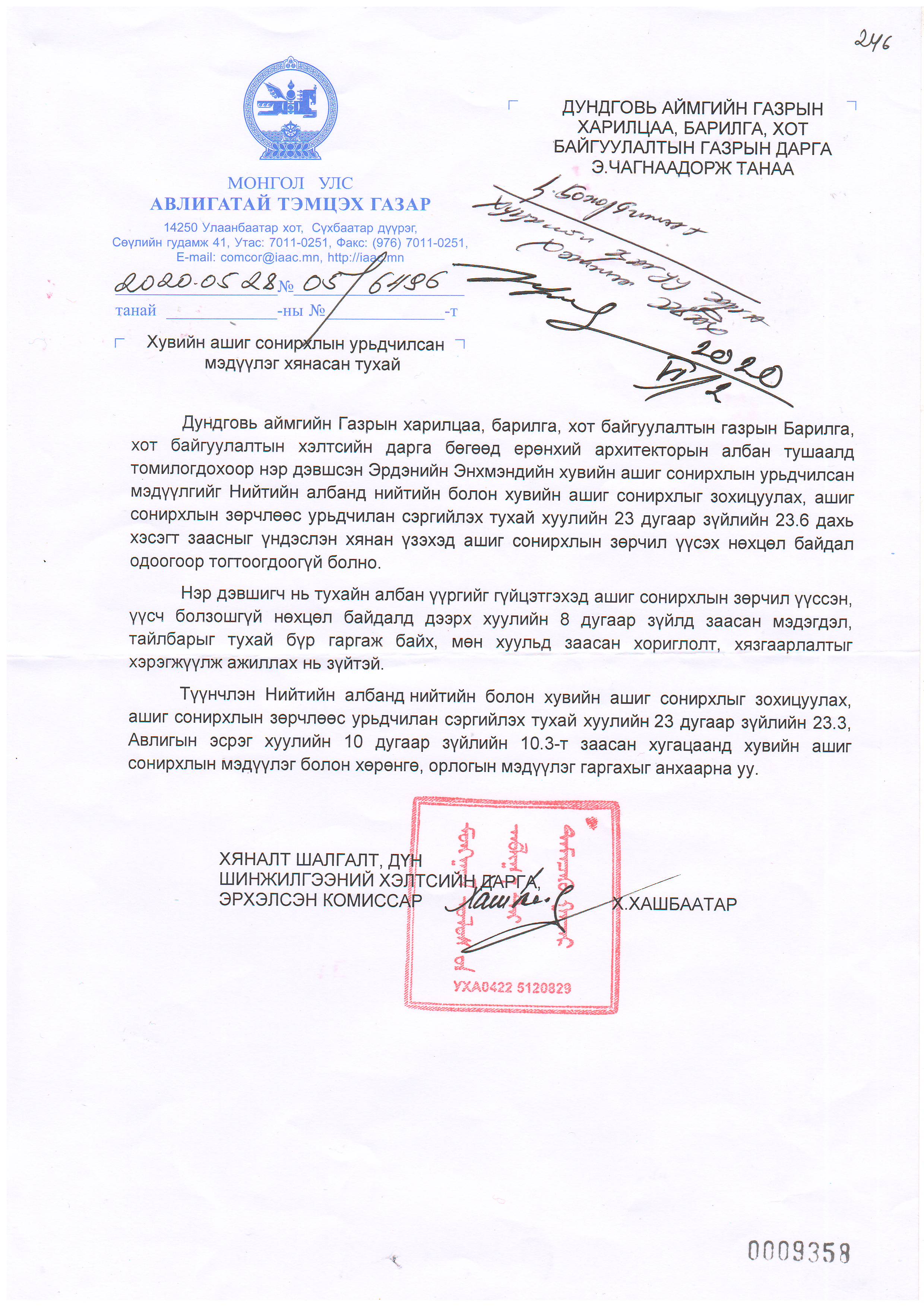 БАРИЛГА БАЙГУУЛАМЖИЙГ АШИГЛАЛТАД ОРУУЛАХЫГ ЗӨВШӨӨРСӨН УЛСЫН КОМИССЫН ДҮГНЭЛТ